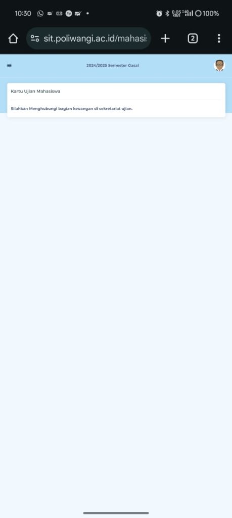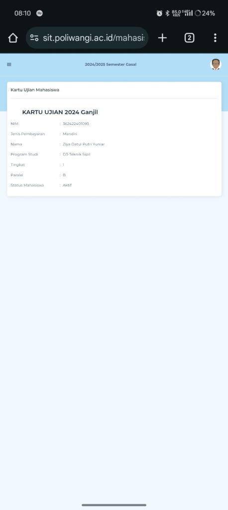 Pada Ujian Akhir Semester ganjil 2024-2025 kali ini menggunakan kartu ujian yang bisa di lihat pada akun sit.poliwangi.ac.id masing-masing mahasiswa. Kartu Ujian tersebut tidak perlu di donload oleh mahasiswa, namun wajib di tunjukkan kepada pengawas ujian di dalam ruang ujian sebelum peserta ujian (mahasiswa) mengerjakan ujian. Di dalam kartu ujian tersebut tertuang data diri mahasiswa yang bersangkutan dan verifikasi untuk mengikuti Ujian Akhir Semester Ganjil 2024-2025. dengan contoh sebagai berikut