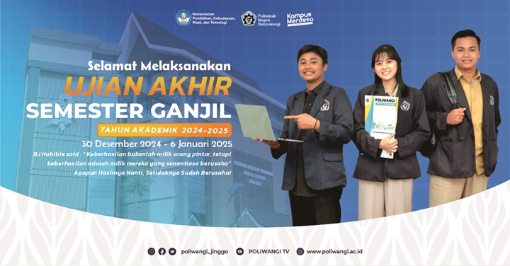 Sesuai Kalender Akademik yang berlaku di Lingkungan Politeknik Negeri Banyuwangi nomor 7047/PL36/KM/2024 maka Ujian Akhir Semester ganjil tahun akademik 2024-2025 dilaksanakan pada tanggal 30 Desember 2024 sampai dengan 6 Januari 2025.